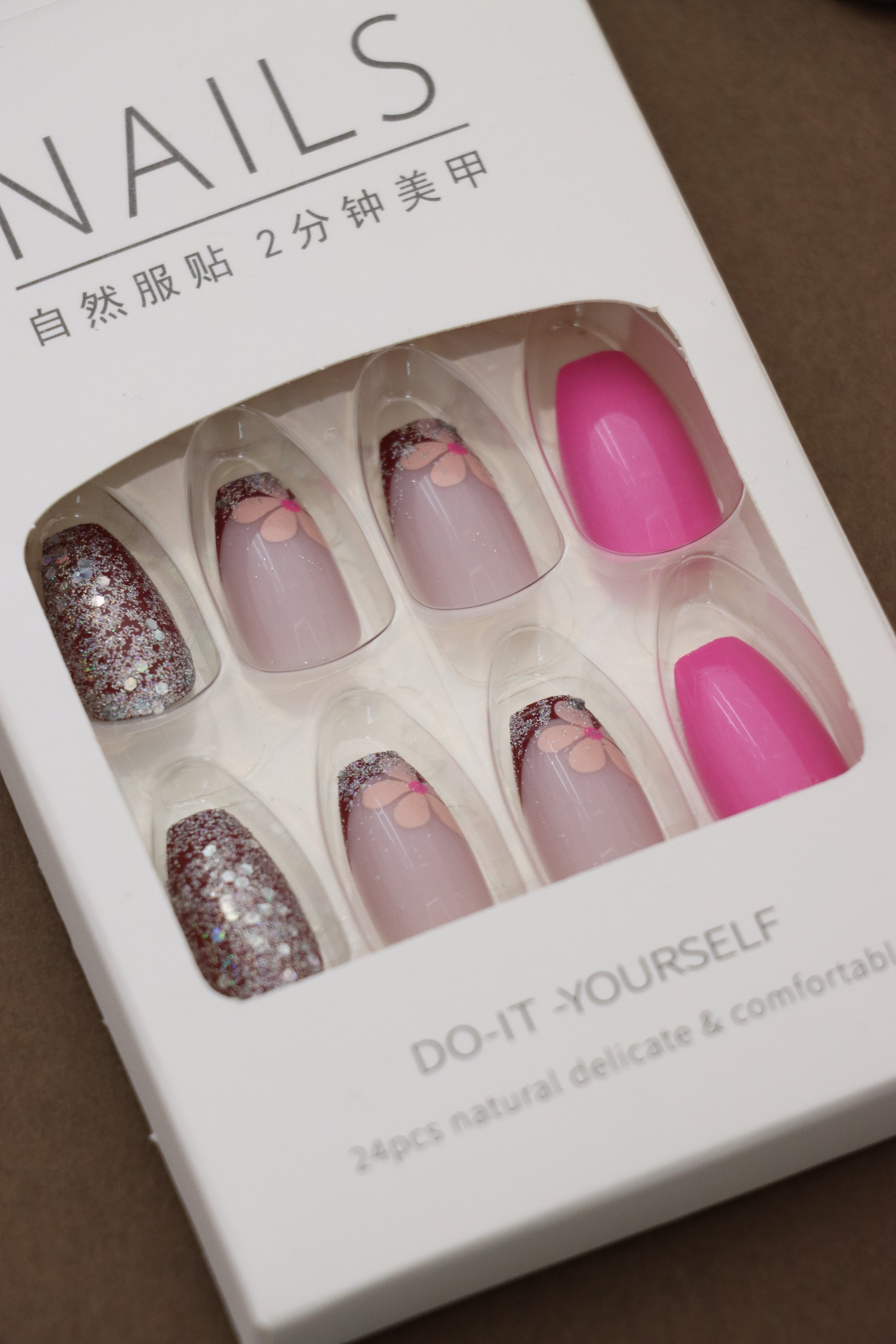Pink Blossom Glitter Press-On Nails - 24pcs Floral Design with Glitter Accents